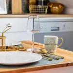 Deluxe Apartment lägenhet är belägen i Duisburgs Huckingen distrikt, ca 25 km från Dusseldorfs internationella flygplatsen. Vattenkokare, kylskåp och köksredskap finns i en kokvrå.